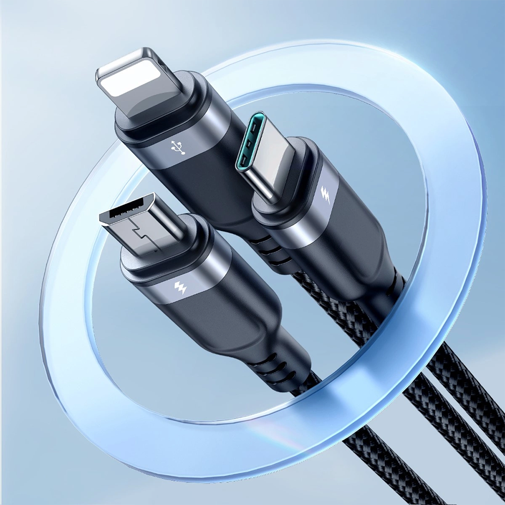 Super smart multikabel fra Joyroom, der gør det muligt at oplade tre enheder samtidig, som bruger henholdsvis micro-USB, USB-C og lightning kabel.