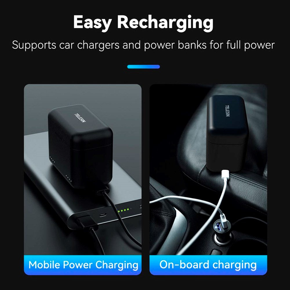 Uanset hvor du befinder dig, sikrer TELESIN Opladningscasen, at dine batterier er organiseret, beskyttet og fuldt opladet – klar til næste eventyr.