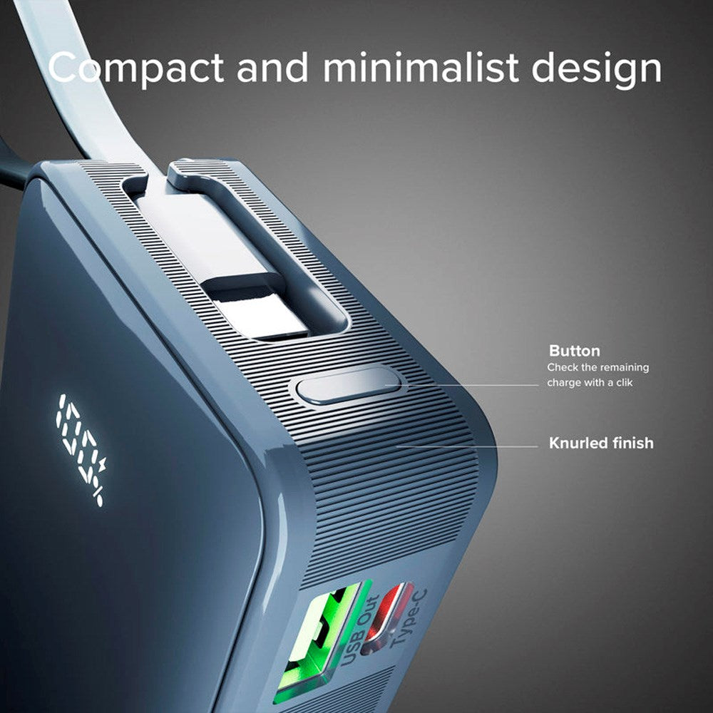 Med et enkelt tryk på tænd/sluk-knappen aktiveres det digitale LCD-display, som viser præcist, hvor meget strøm der er tilbage i PowerBanken. Når batteriet er lavt, kan du nemt oplade den via det indbyggede kabel eller USB-C-porten.