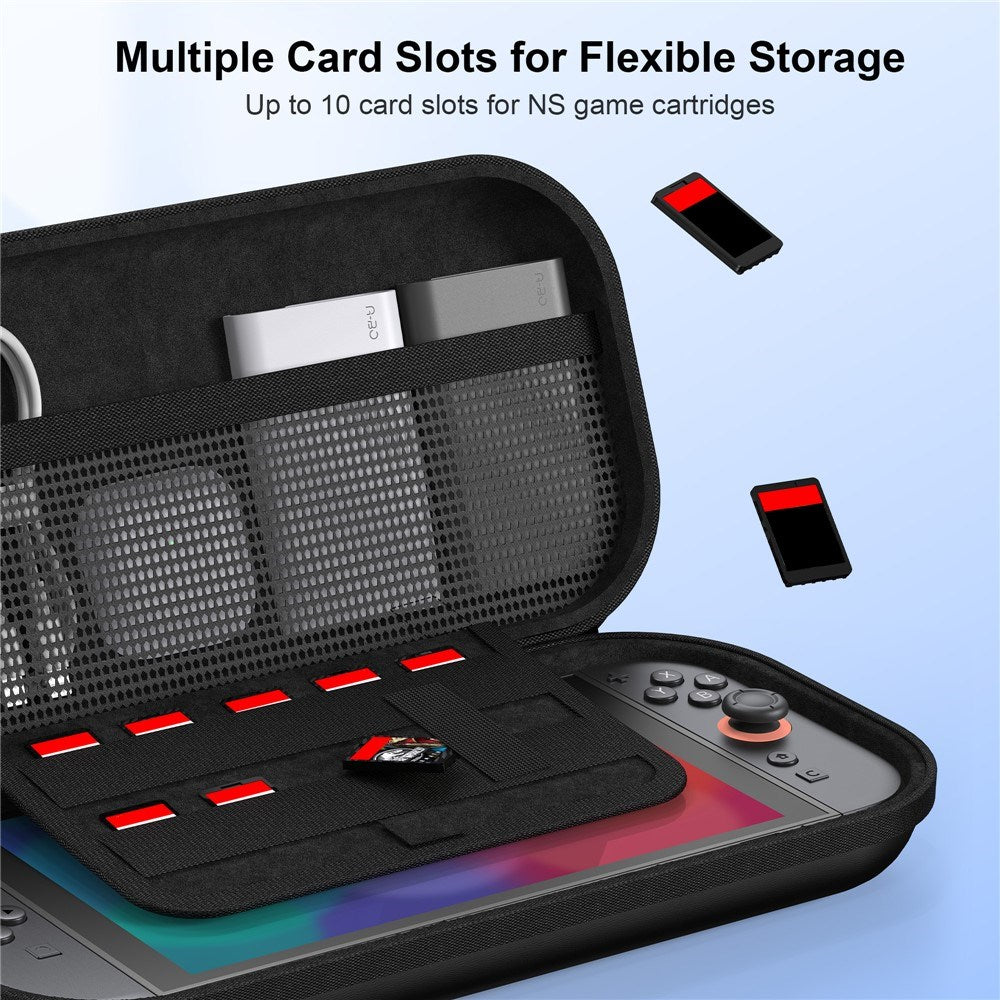 Taskens ydre er lavet som en hård skal og beskytter derved indholdet ved stød og slag. Inde i tasken er der lavet forskellige rum og opbevaringsmuligheder. Ud over at du selvfølgelig kan medbringe din Nintendo Switch 2 kan du også i denne rejsetaske opbevare dine ledninger, SD kort og andet udstyr.