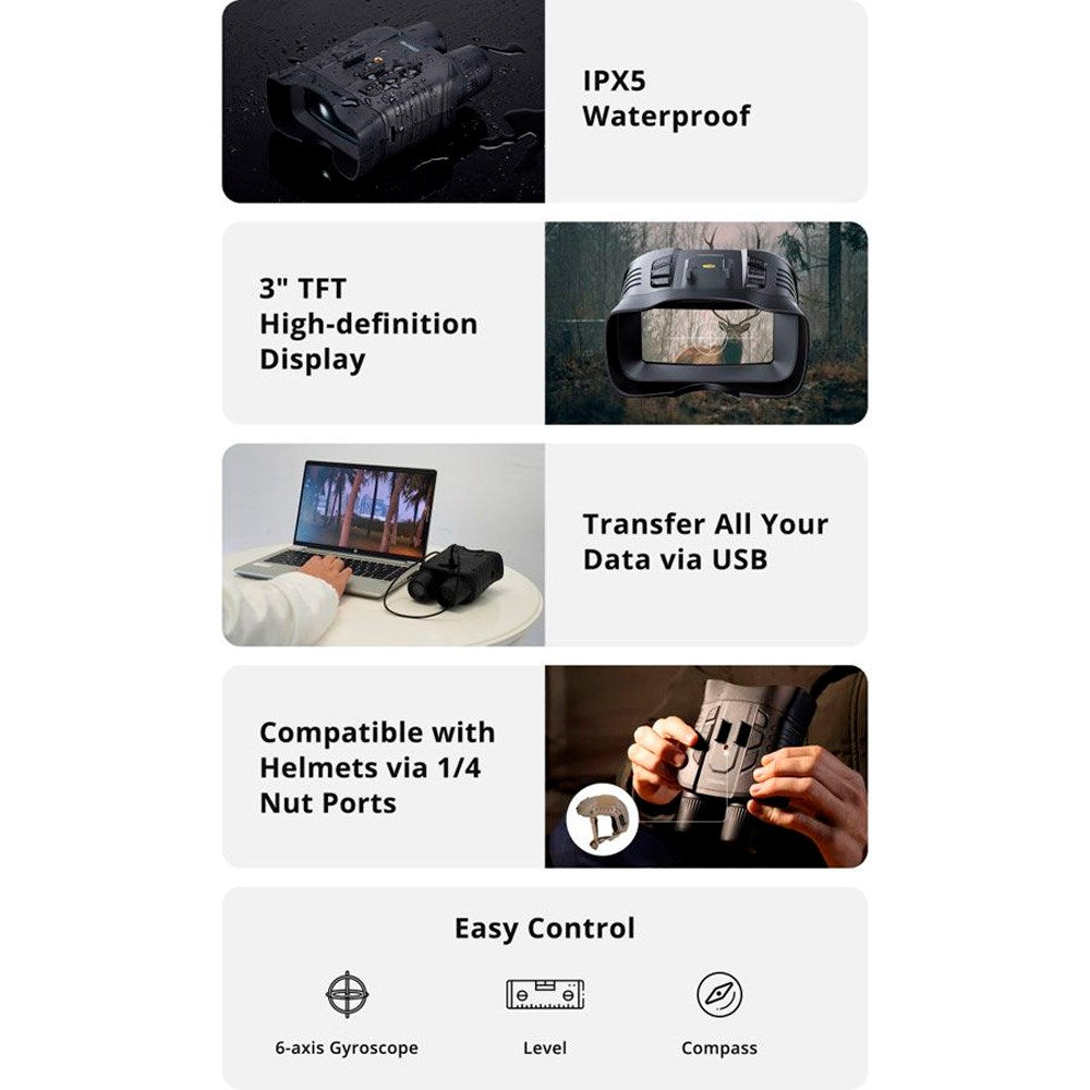Trods sine avancerede funktioner er natkikkerten let og bærbar med en vægt på under 500 gram, hvilket gør den nem at have med i tasken eller fastgøre til hjelm, stativ eller snor. Den robuste IPX5 vandtætte konstruktion sikrer pålidelig brug i alle vejrforhold.